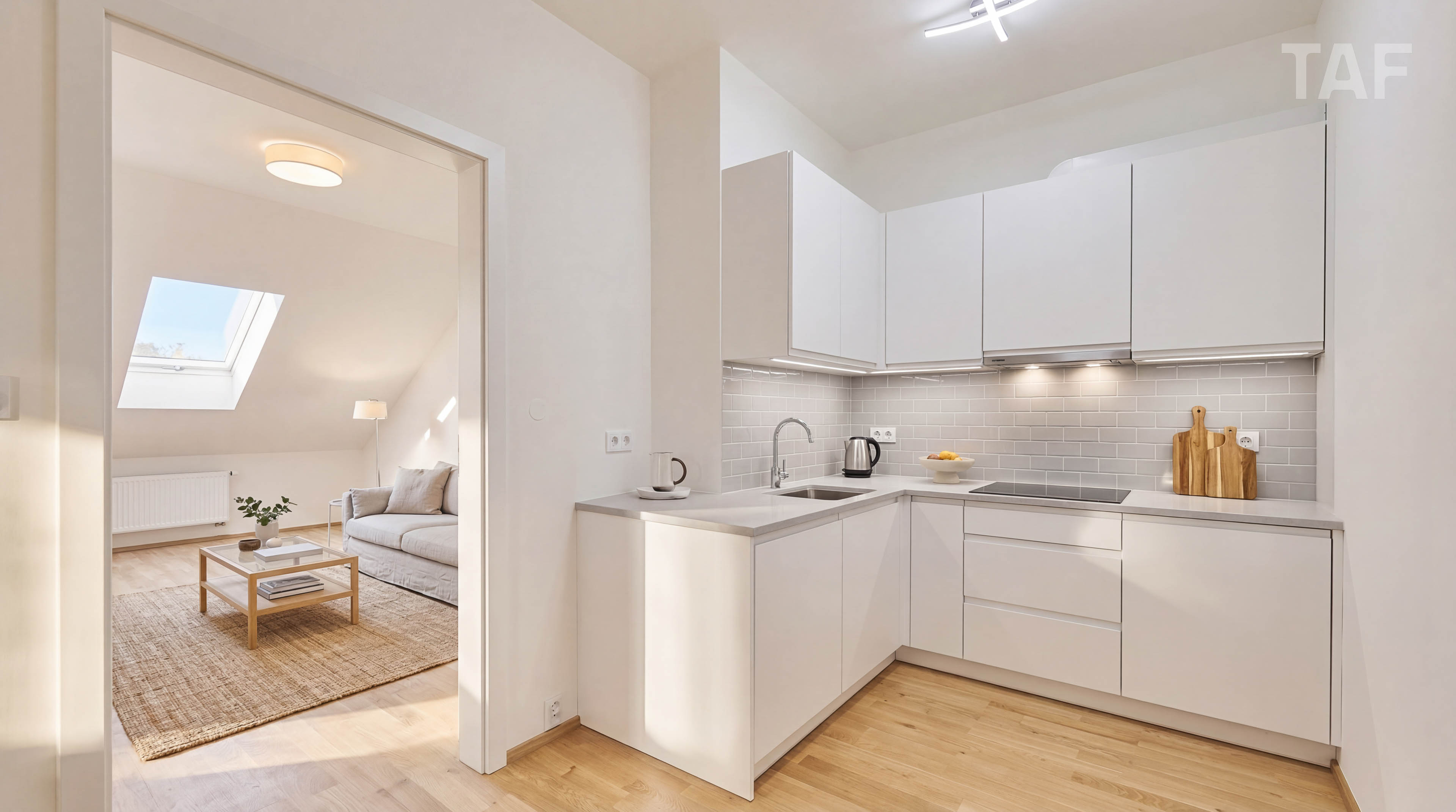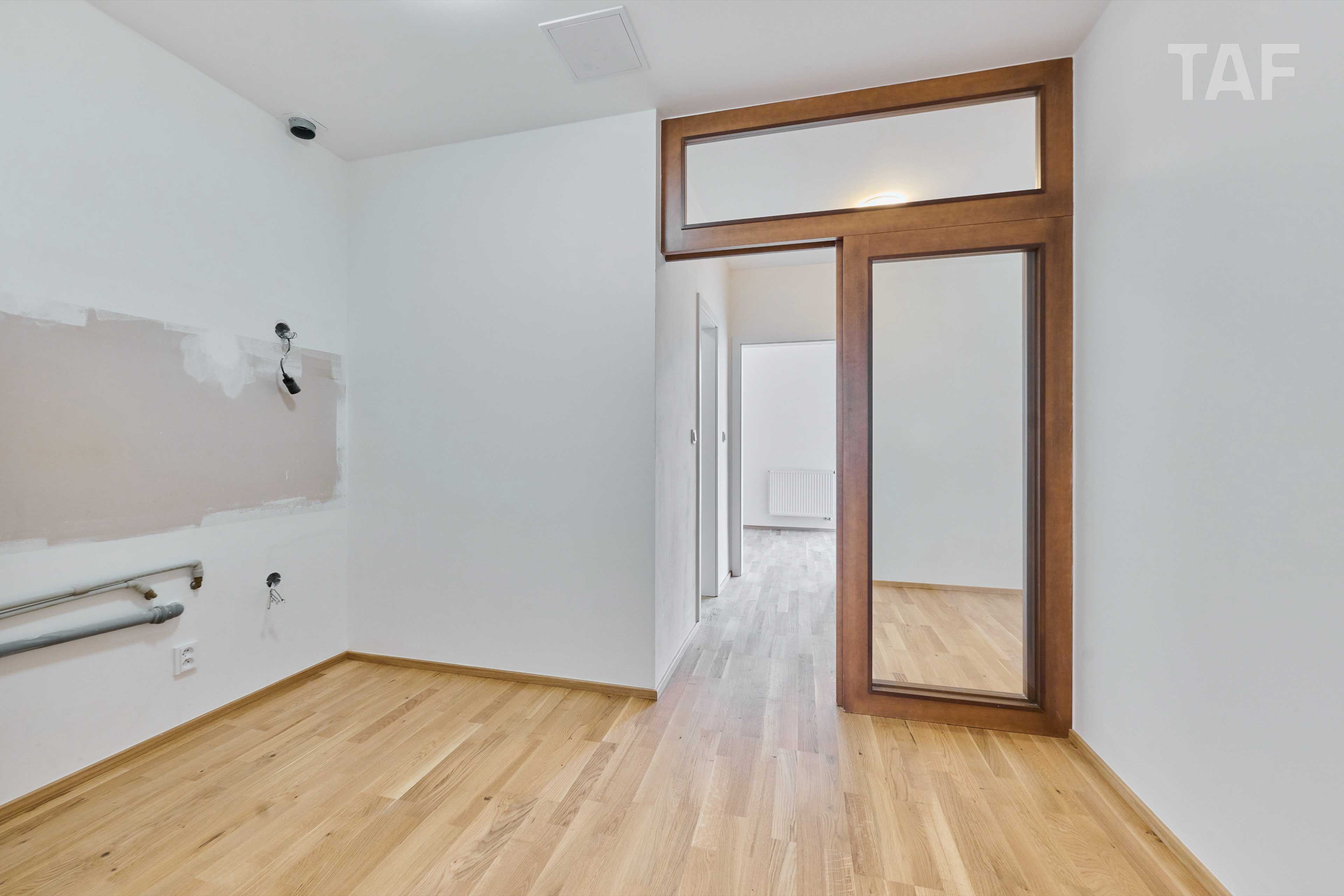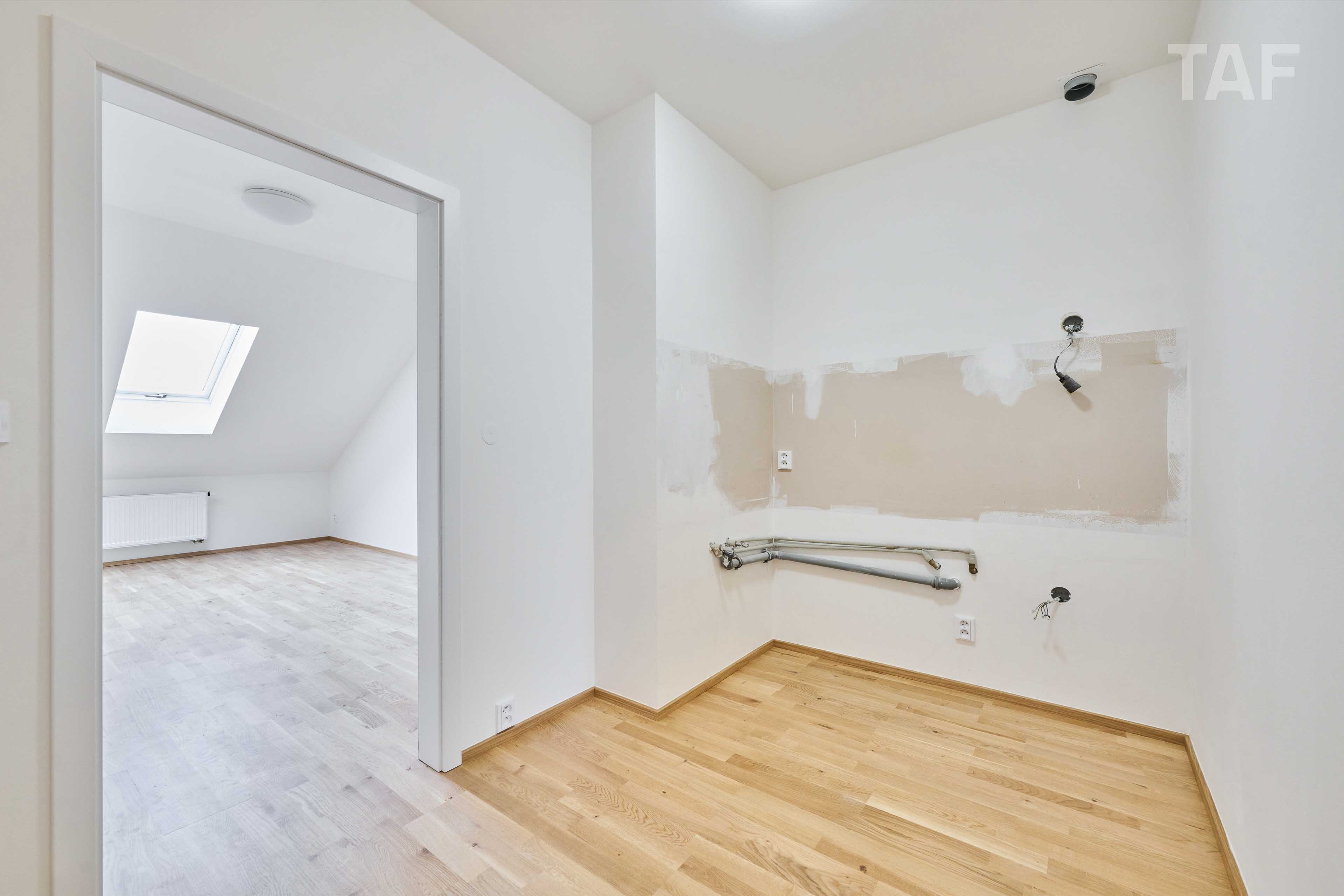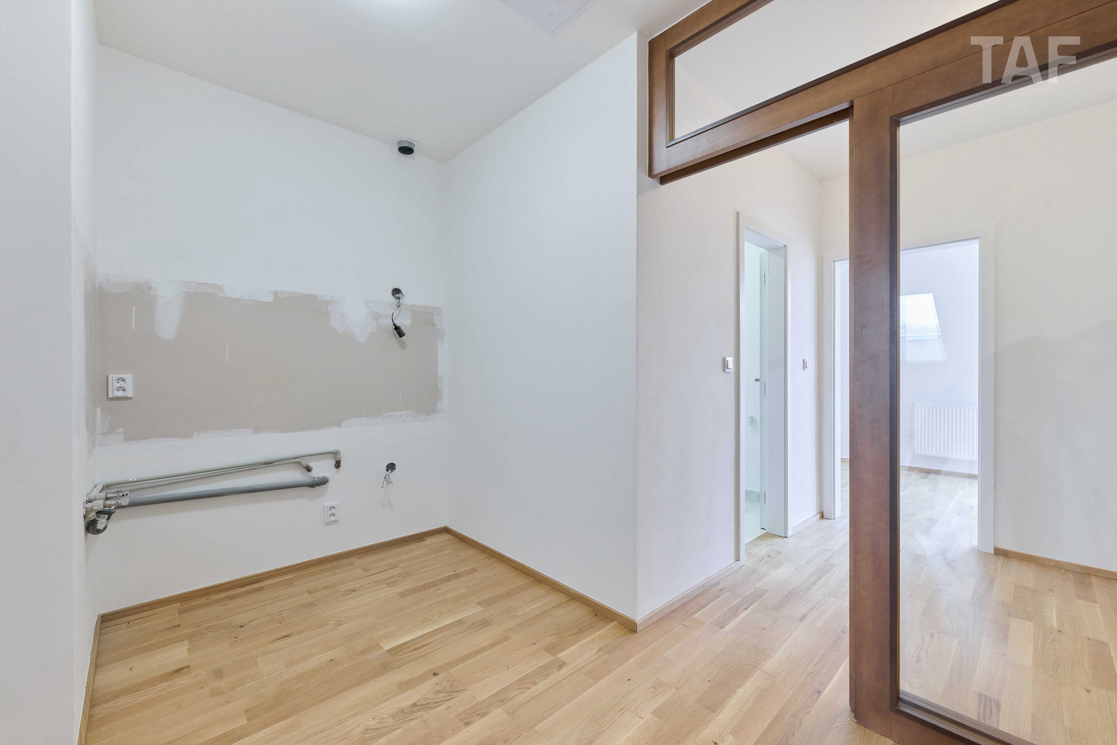 Byt prošel kompletní rekonstrukcí a je připraven na instalaci nové kuchyňské linky. Kuchyň a nábytek zobrazené na fotografiích slouží jako vizualizace možného řešení. Novou kuchyňskou linku je možné realizovat na míru dle přání budoucího majitele.